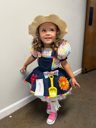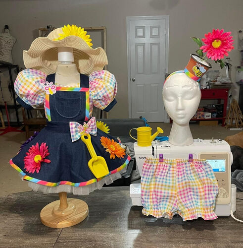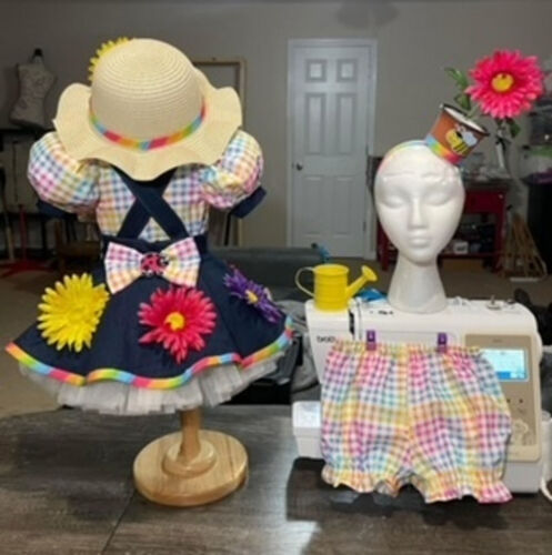 Chest and waist will fit 17.5-21.5 inches, dress length can adjust from 15.5-18 inches. Comes with hat, flower pot headpiece and bloomers.