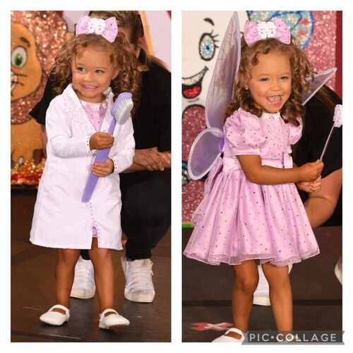 • A sparkling pink polka-dot fairy dress with matching wings and wand for a magical stage entrance.