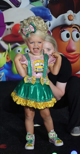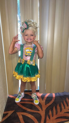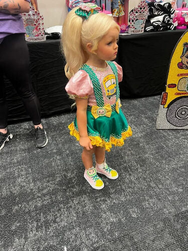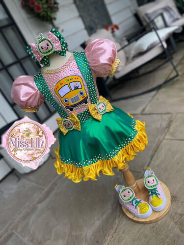 This custom one-of-a-kind OOC features a bright and playful Cocomelon school bus theme with a vibrant green and yellow color combo and pink puff sleeves. The bodice includes a fully stoned bus applique with character detailing, and two bow accents with matching character faces. The outfit is finished with a yellow satin ruffle hem and rhinestone embellishments throughout for maximum stage sparkle.
