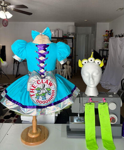 Designed by Valerie Cyrus, this dazzling custom OOC brings Pixar magic to life! Inspired by the iconic green aliens from Toy Story, this vibrant turquoise dress features layered holographic trim, purple accents, and sparkling alien appliqués. The structured puff sleeves and flared skirt add stage-worthy volume, while lime rhinestone tights and matching alien headband give this look a playful, character-perfect finish. Ideal for themed pageants, this set even comes with a Nerds candy prop for a sweet twist!