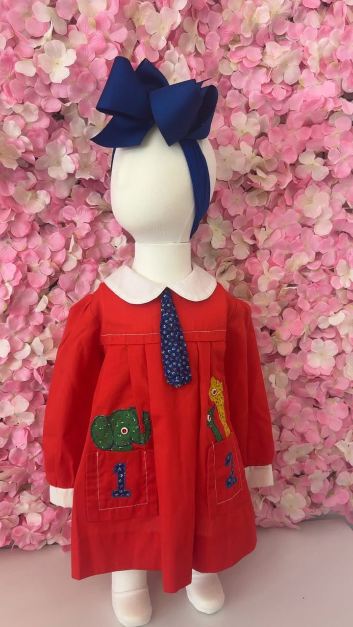 Meet Dina the cutest Daycare Wear out there! She is a long sleeve dress with red bloomers and a matching navy bow. She features stitched numbers on her pockets and stitched animals peeking out. She is absolutely adorable and so fun!
