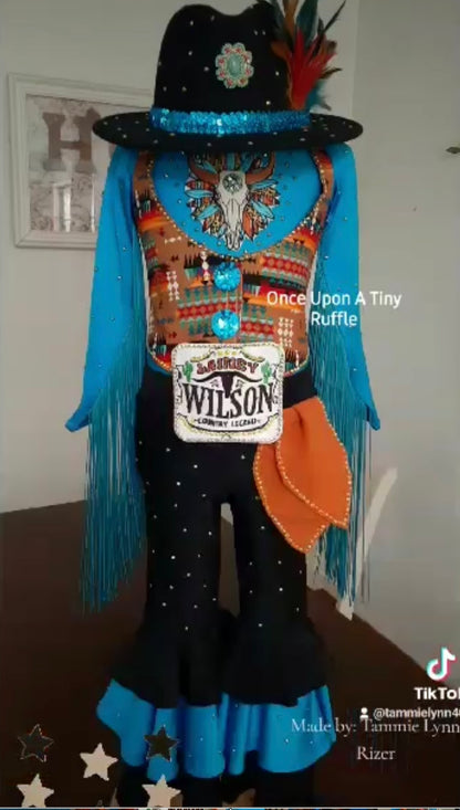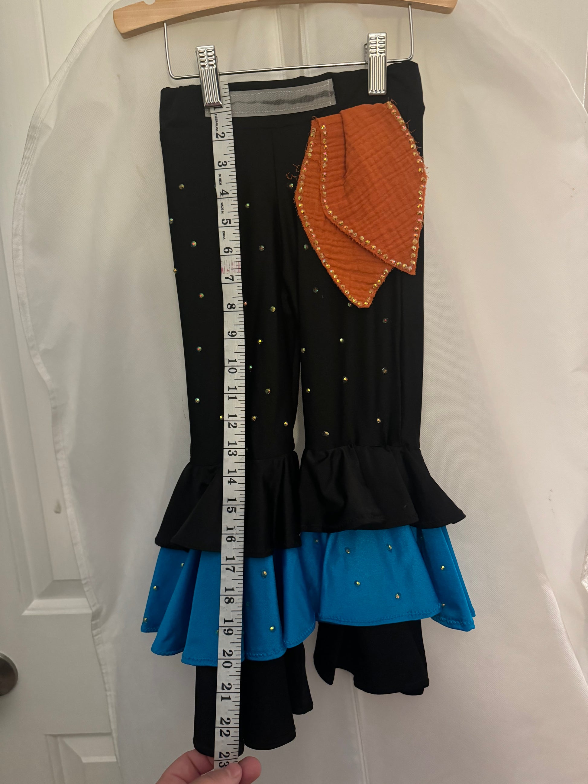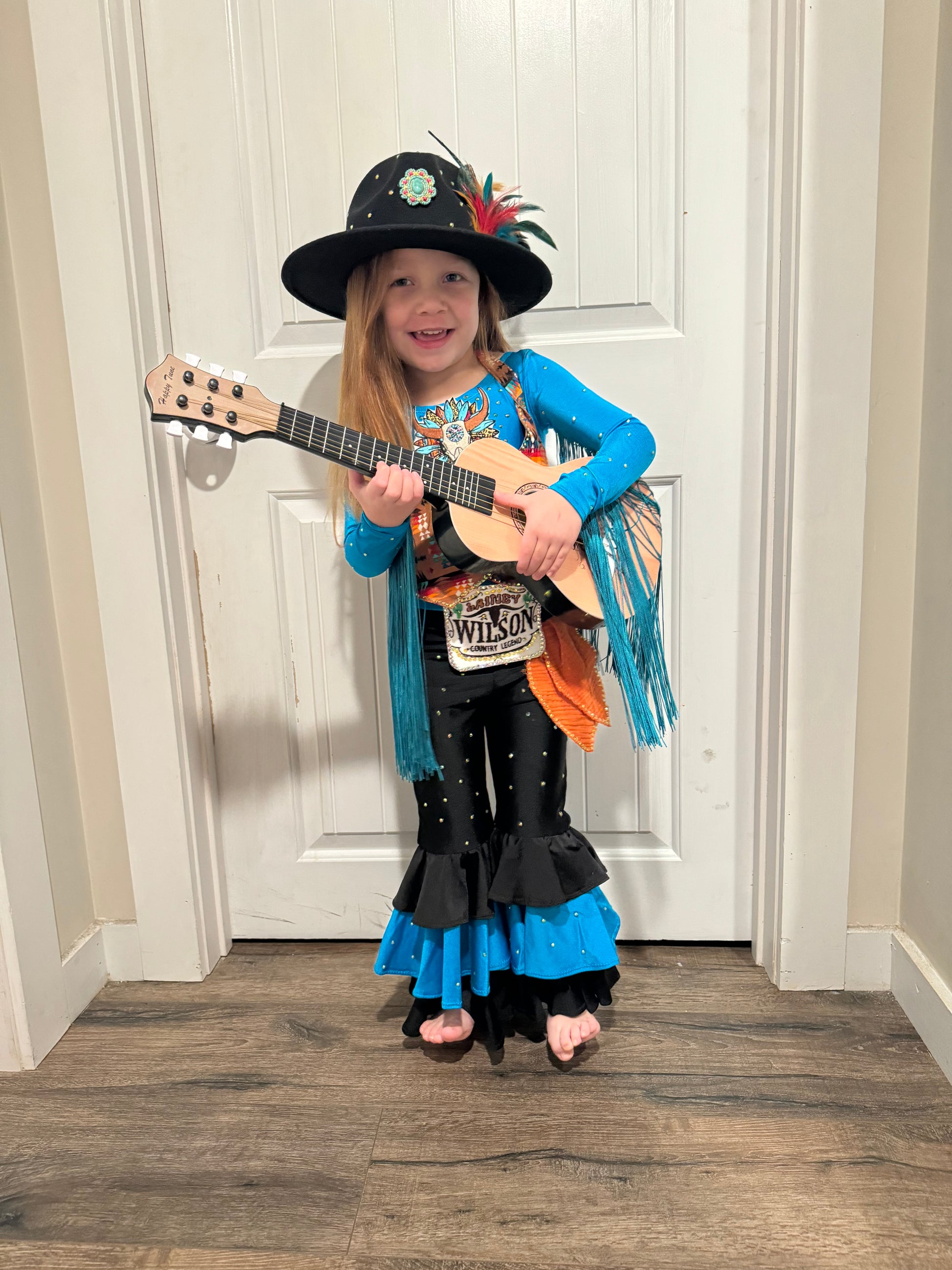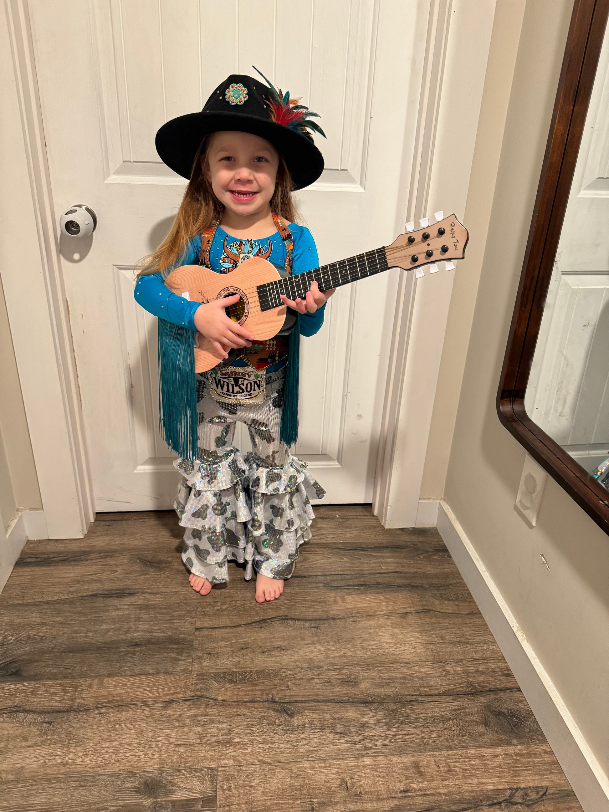 Lainey Wilson would be proud! This adorable OOC is a design created by Once Upon a Tiny Ruffle. The bodice is a onesis style with plenty of stretch. The pants are also very versatile and able to stretch as well. Measurements unstretched are in the pictures. Also comes with a cowprint pant design option. Guitar can be rented for an additional $20.