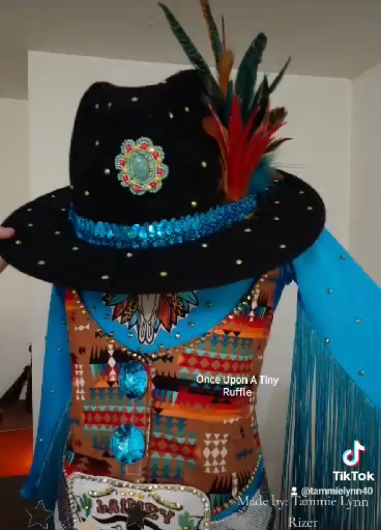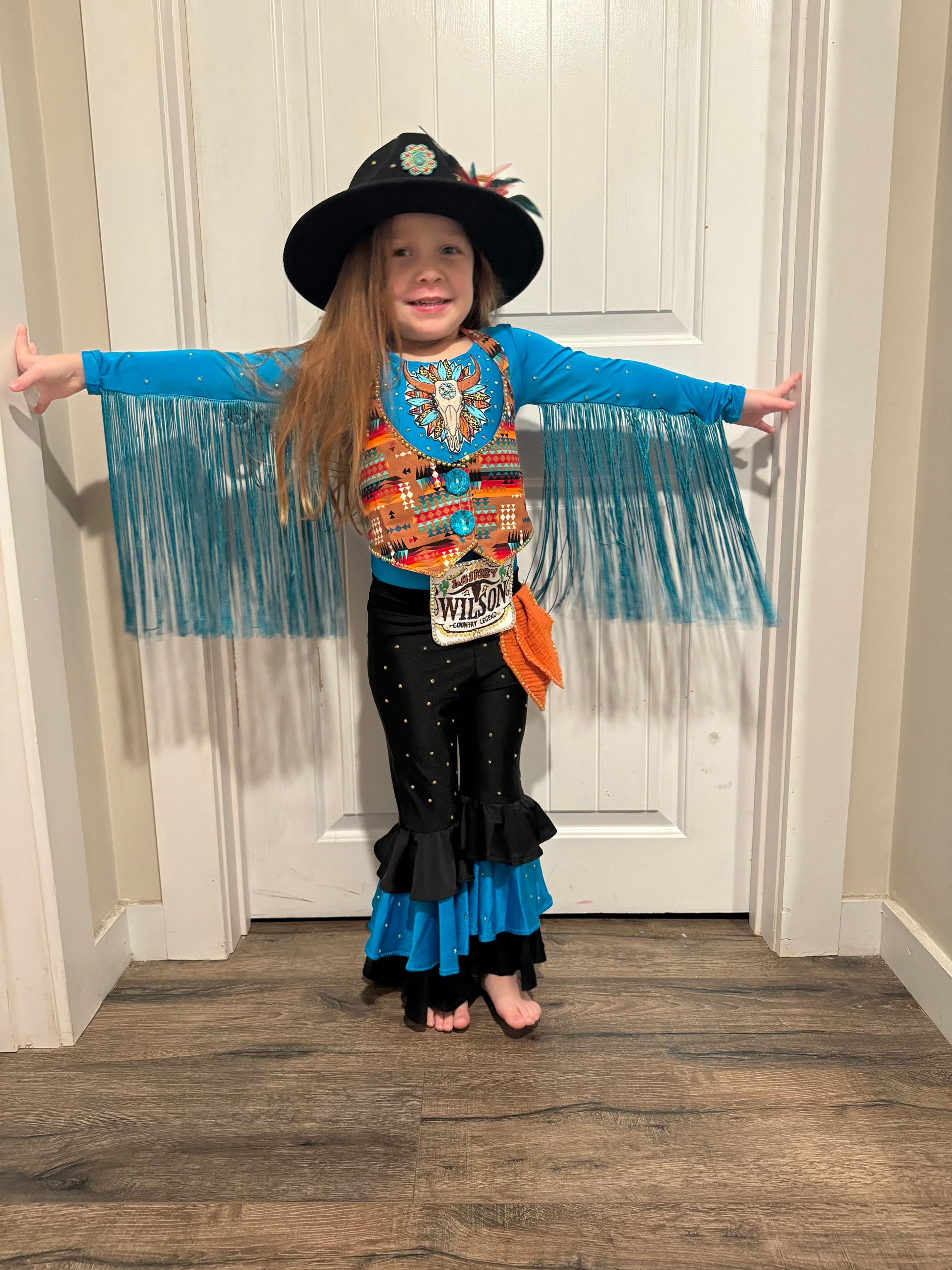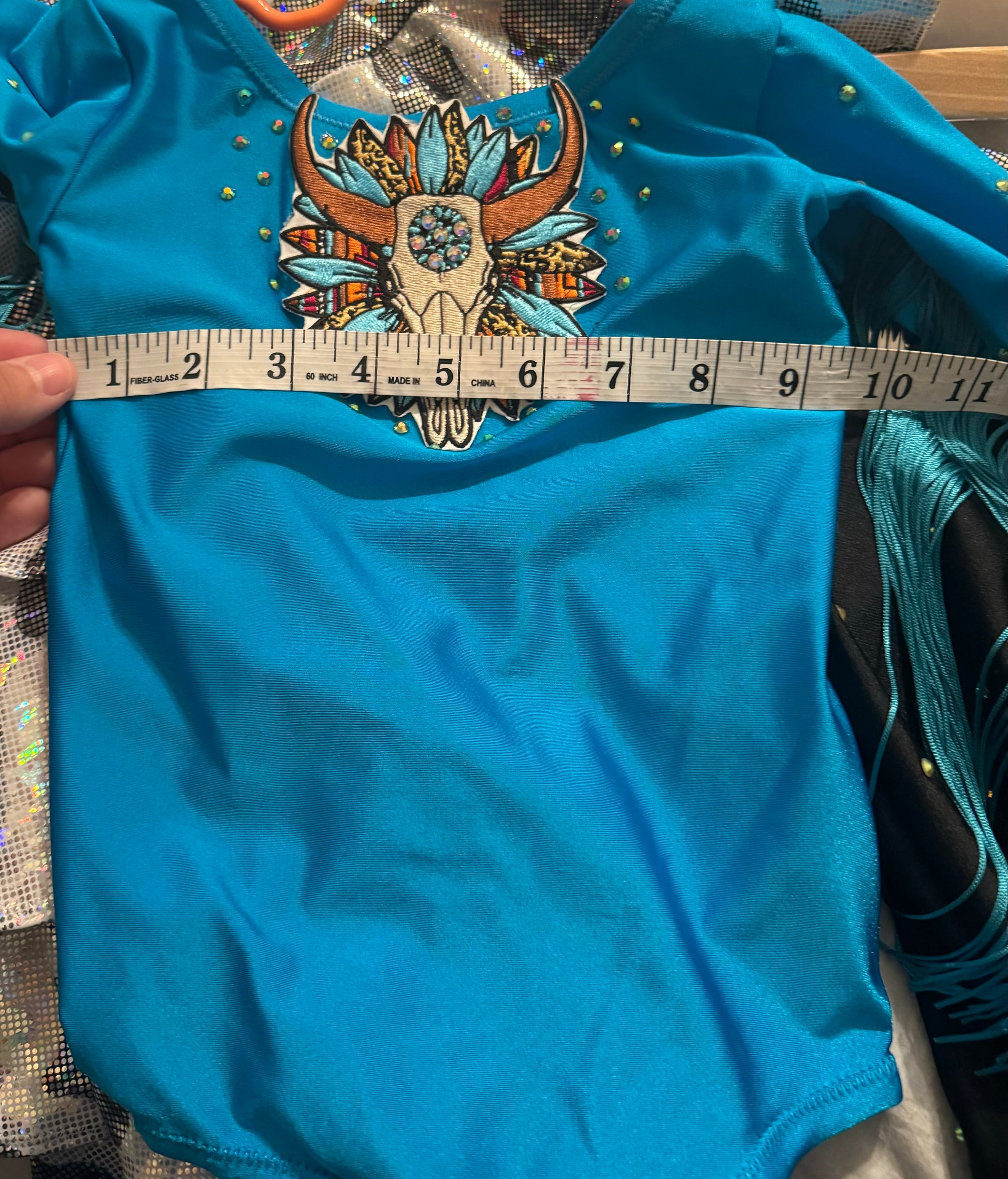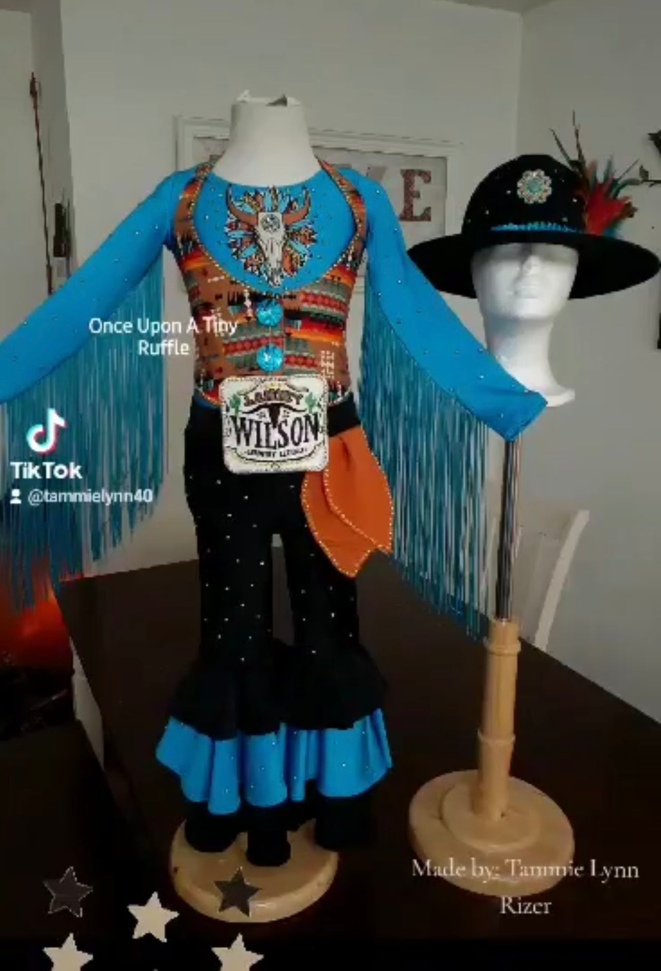 Lainey Wilson would be proud! This adorable OOC is a design created by Once Upon a Tiny Ruffle. The bodice is a onesis style with plenty of stretch. The pants are also very versatile and able to stretch as well. Measurements unstretched are in the pictures. Also comes with a cowprint pant design option. Guitar can be rented for an additional $20.
